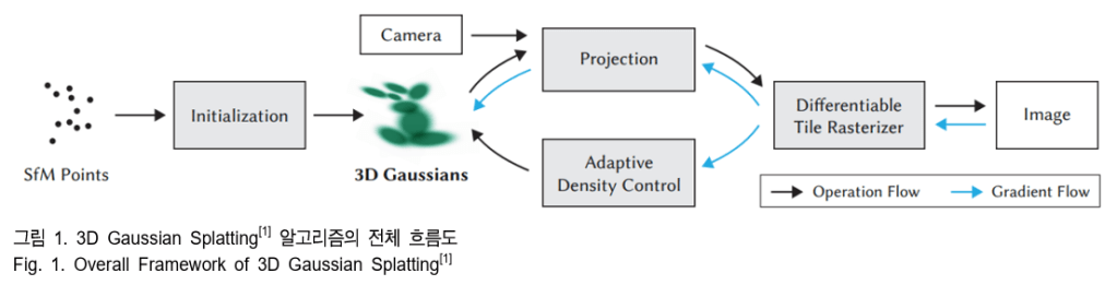 - 입력 데이터: COLMAP 같은 Structure-from-Motion(SfM) 기법을 사용해서 초기 3D 포인트 클라우드를 생성
