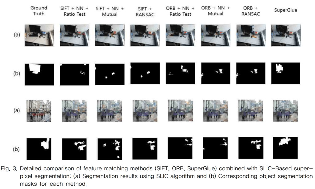 본 실험에서는 정합된 특징점들이 포함된 슈퍼픽셀들을 집합으로 묶어 ROI를 형성, SuperGlue 기반 정합을 통해 생성된 마스크는 다른 방법들에 비해 객체의 경계를 더 명확하게 분할하고있으며, 이는 제안된 방법이 객체의 주요 부분을 보다 정확하게 인식할 수 있음을 시각적으로 나타냄