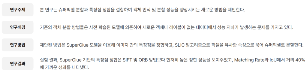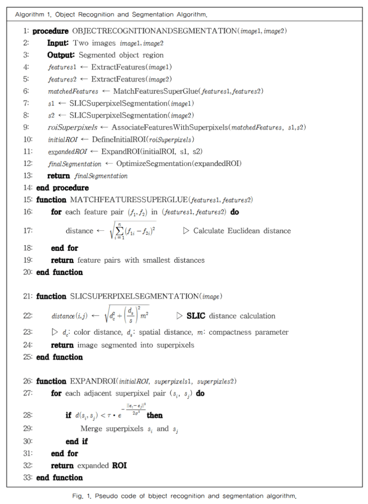 영상 특징점 정합과 슈퍼픽셀(Superpixel) 분할을 결합한 새로운 객체 인식 및 분할 방법을 제안, 본 연구에서 제안하는 방법은 딥러닝 기반의 SuperGlue 모델을 사용하여 영상 간의 특징점을 정합한 후, SLIC(Simple Linear Interative Clustering) 알고리즘을 적용하여 영상의 픽셀을 유사한 속성으로 묶어 슈퍼픽셀로 분할하는 과정으로 구성됨. 이 과정을 통해 단순한 영상 분할을 넘어 객체의 경계를 명확히 정의하고, ROI를 효과적으로 추출할 수 있다.