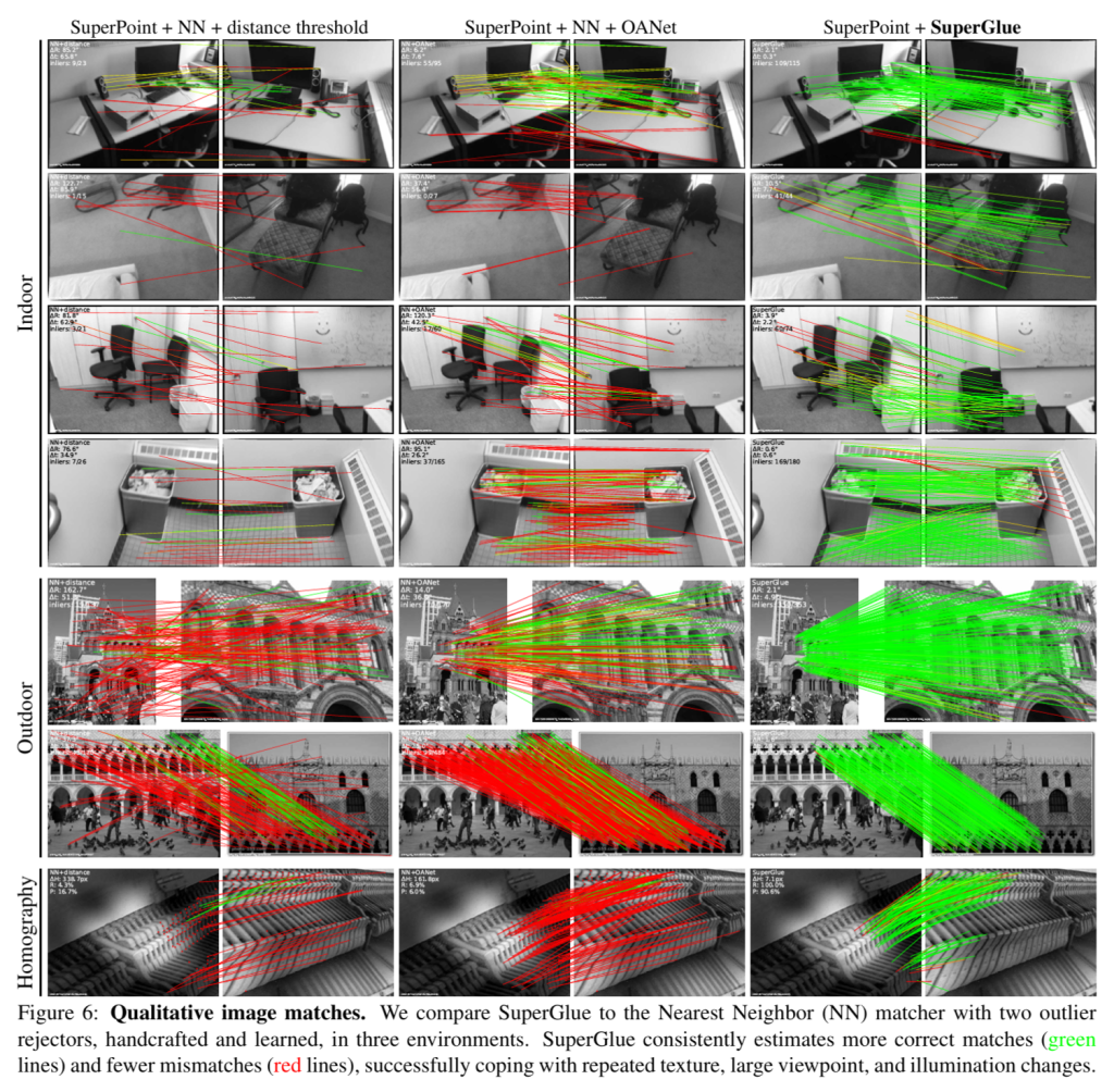 - SuperGlue는 가장 많은 수의 특징점을 성공적으로 정합하여, 매우 촘촘하고 정밀한 정합 결과를 도출함