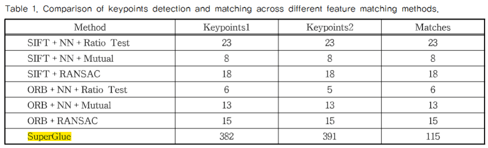 - SIFT와 ORB는 SuperGlue에 비해 정합 점의 밀집도가 떨어짐