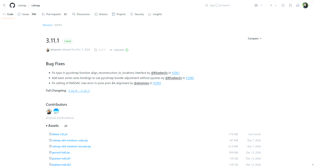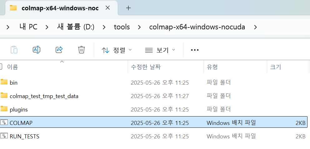 Release binary 활용 colmap-x64-windows-nocuda.zip (CUDA 없이 CPU용)