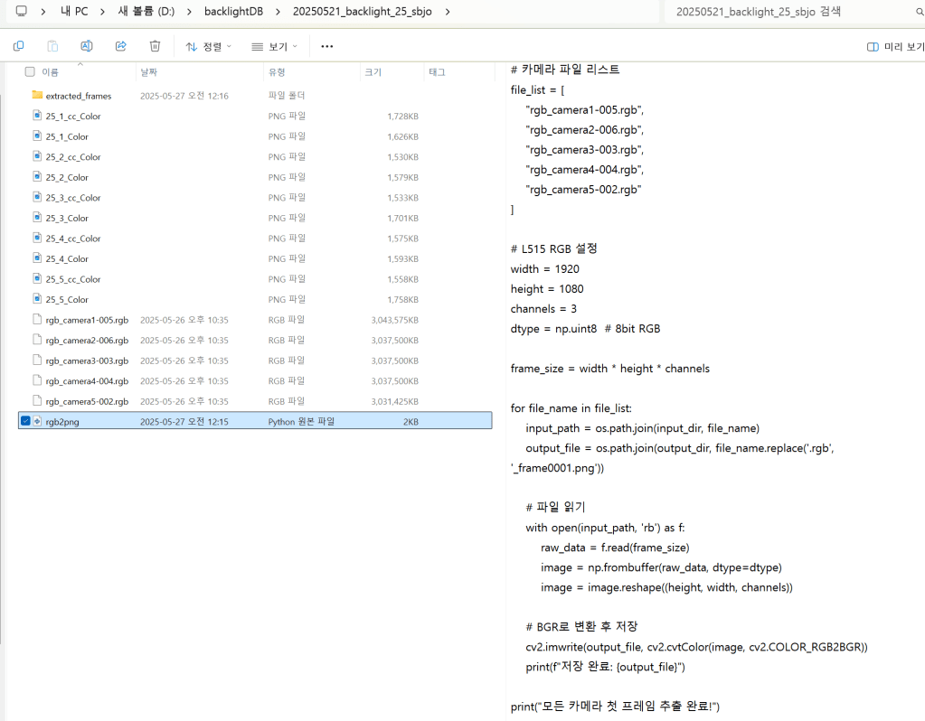 - 비트 깊이 (bit depth): L515 RGB는 보통 8bit per channel