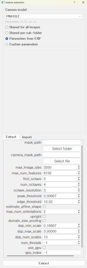 - feature extraction/matching 파라미터