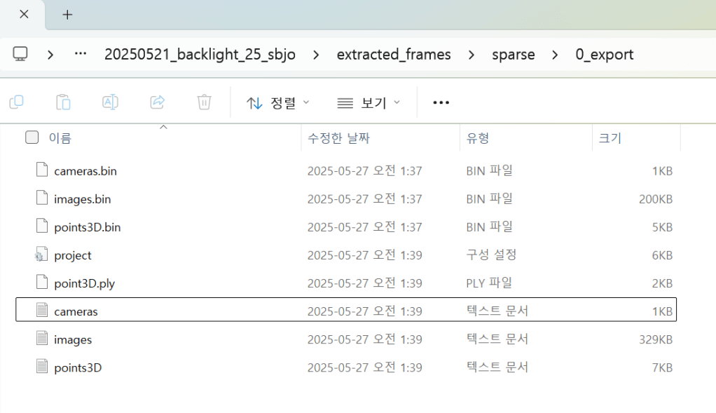 cameras.bin | 각 카메라의 intrinsics (fx, fy, cx, cy, distortion 등) |